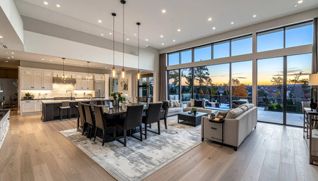 Elegant open concept home interior with a large dining area, living space, and city view through windows.