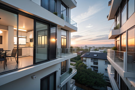 AI Generated. Modern building architecture with balconies under clear blue sky on a sunny day