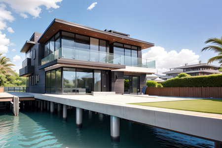 A contemporary waterfront house with large windows showcasing a futuristic design created with technology