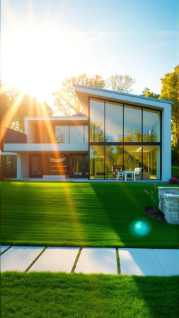 A contemporary house showcases its minimalist design with large glass windows and a flat roof. Bright sunlight illuminates the structure enhancing the modern aesthetic against a vibrant sky.