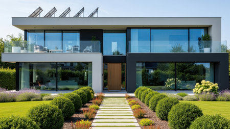 This image showcases a modern, sleek house with expansive glass windows and solar panels on the roof. The house features a contemporary design with clean lines and a minimalist aesthetic. The front yard is well-maintained with neatly trimmed bushes and a paved walkway leading to the entrance.
