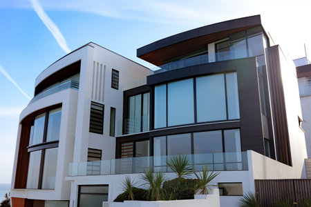 A contemporary residential building showcases a modern architectural design with clean lines and geometric shapes. The exterior features a combination of neutral colors, glass, and wood. The composition is well-lit, suggesting a sunny day, highlighting its potential for use in architectural, real estate, and design publications.