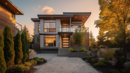 A contemporary home exterior with a sleek design, large windows, and a beautifully landscaped yard