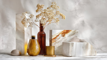 This elegant still life features a harmonious arrangement of decorative objects and dried flowers, capturing modern aesthetics and inspiring creative home decor ideas.