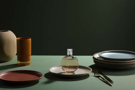 Stacks of colorful porcelain plates, cups and vases on green background