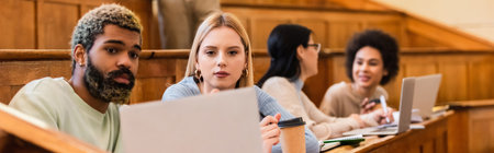 Interracial students using laptop near coffee to go to university, banner