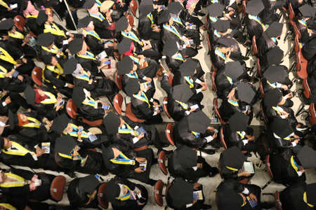 Top view of group of university graduates in black gowns lines up for degree in university graduation ceremony. Yogyakarta, Indonesia - December 2019.