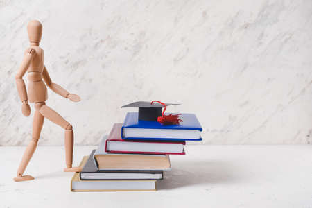 Steps of education leading to success goal. Taking strategic steps towards graduation. Career path and first for business, Graduation achievement goals concept. Graduation cap on wooden block.