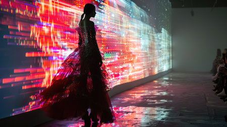 A fashion model wearing a glowing, transparent dress walks the runway at a fashion show. The background features a backdrop of red and white lights, creating a futuristic aesthetic.