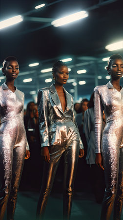 The vintage model showcases a stunning metallic outfit on the runway, embodying the retro futuristic fashion trends. A Stunning Woman Collection in trendy grey shiny shades