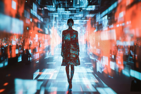 A runway show featuring glowing holographic models against a backdrop of digital data screens and futuristic lighting.