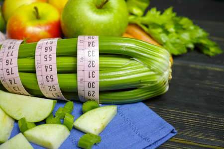 Green vegetables and fruits - celery shoots and apples, healthy fitness diet concept