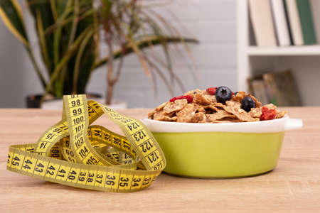 cereal bowl with measuring tape, health and diet concept