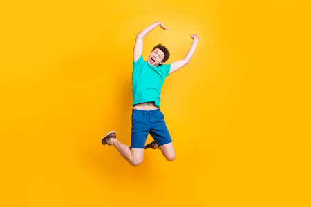 Full size length body picture of handsome curly-haired playful young guy wearing casual green t-shirt, shorts, shoes, jumping, hands up, celebrating prize winning. Isolated over yellow background