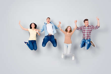 Photo of crazy excited carefree funny man jump open mouth wear casual jeans clothes on yellow background