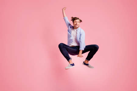 Full length body size photo of jumping high crazy he his him handsome unusual pose shape figure dancing glad wearing casual jeans checkered plaid shirt isolated on rose background