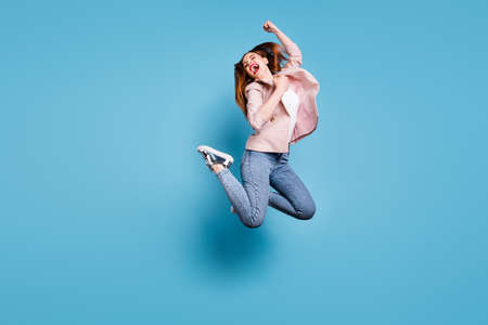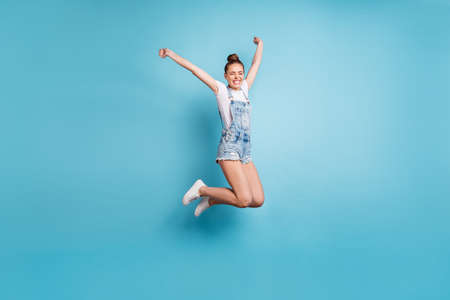 Full length body size photo of girl jumping with joy walking on air while isolated with blue background