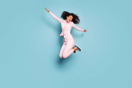 Full length photo of amazing dark skin lady jumping high spread hands sides spending best free time wear pink shirt trousers sneakers isolated blue color background