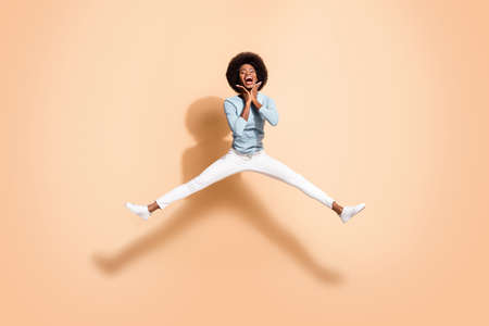 Photo portrait of black skinned woman holding two hands near face jumping up with spread legs open mouth isolated on pastel beige colored background