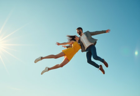 A joyful couple jumps into the air together outdoors against a bright blue sky. The image captures energy, freedom, and happiness in an outdoor setting.