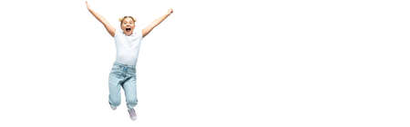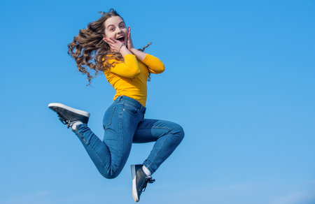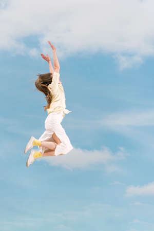 happy child jumping on the background of the sky. freedom to feel good and summer vacation concept.
