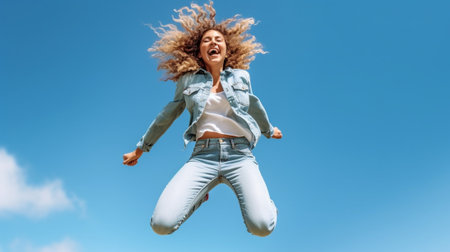 Girl floating in the air against the background of blue sky and clouds. Carefree young woman during jump