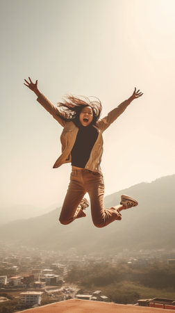 Young foxy lady jumping on stairs near city landmark at sunny day Cool girl wearing trendy outfit smiling and posing in motion : Generative AI