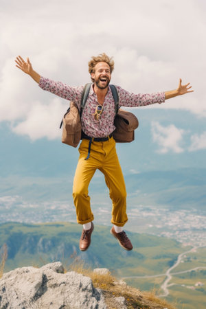 Man hipster jumps with backpack. Carefree happiness freedom concept. Hipster man with beard and moustache in hat jumps with axe on mountain top on cloudy sky.