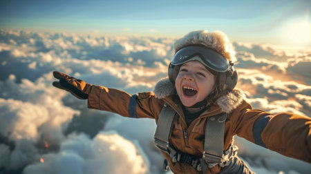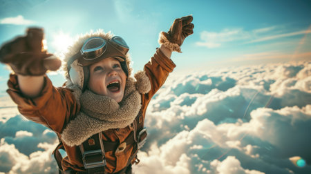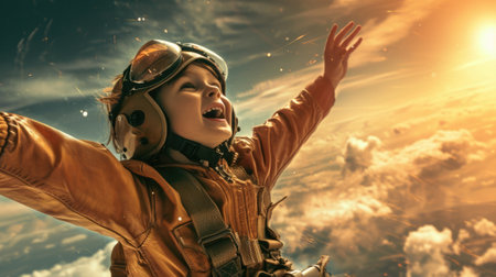 The side view of the picture that has the child flying into the bright sky with the aviator costume and the pair of goggles under the bright light of the bright sun with the happy smile face. AIGX03.