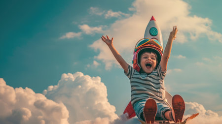 The side view of the picture that has the child flying into the bright sky with the flying object that has been called the rocket yet the size of a rocket so small but it size same with child. AIGX03.