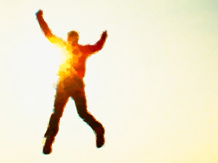 Jumping man in the sky. Man jumping in the sunshine against blue sky. Concept: freedom, success, energy, vitality.
