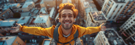 Backpacker Caucasian man with outstretched arms standing on the roof of a city building.
