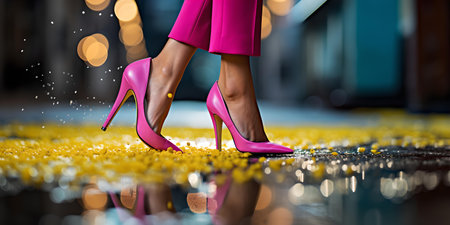 Bright pink high heels amidst golden autumn leaves, under city night lights. fashionable urban life scene. A.I.
