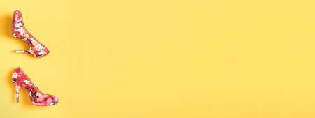 Bright colored pink women's shoes with medium heels on a yellow background. Extra banner. Top View. Flat Lay. Copy Space. Shoes sale, ad design concept