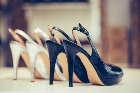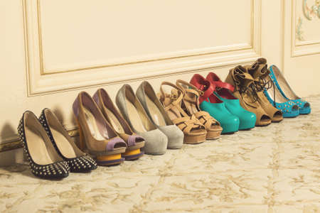 Multiple pairs of kitten, stiletto high heels of different colors. Woman classic dress shoes aligned on a floor.
