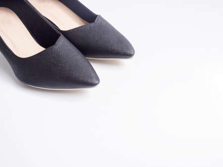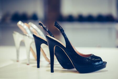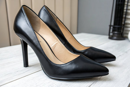 Beautiful black women's shoes on a white wooden table. Selective focus.