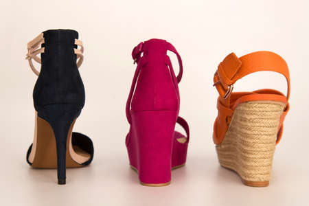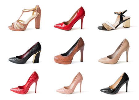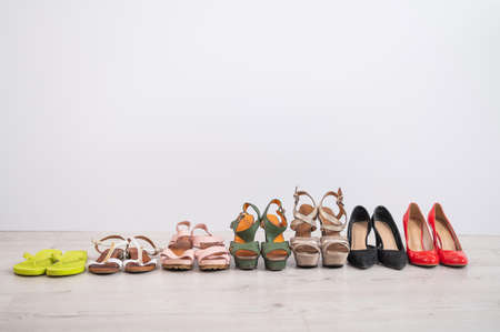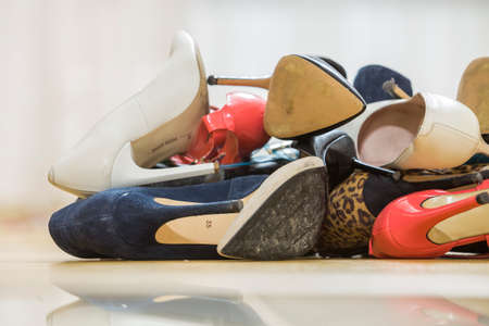 Pile of fashionable different colors high heel female shoes isolated on light copy space background. Style and fashion, sale and shopping modern footwear concept.