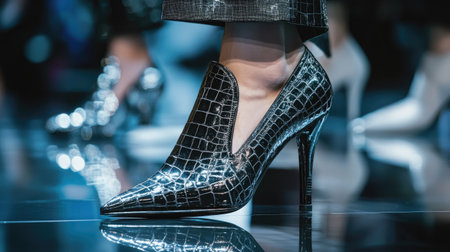Stunning close-up of glossy high heel shoes featuring a unique crocodile texture showcased on a fashion runway, emphasizing elegance and style.