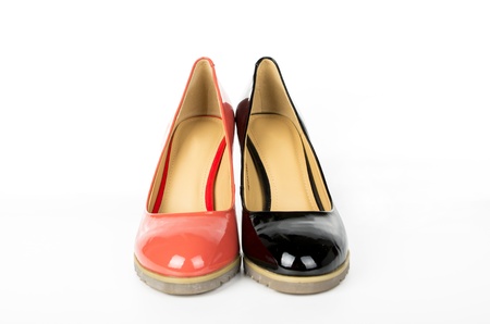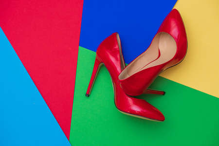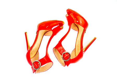 Fashion and footwear. Red high heel classic shoes outdoor during sunny day.