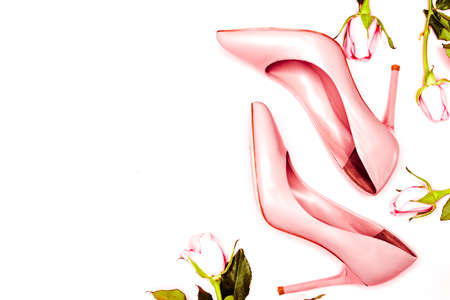 Beauty blog concept. pink nude female shoeson white background. Flat lay, top view trendy fashion feminine background.