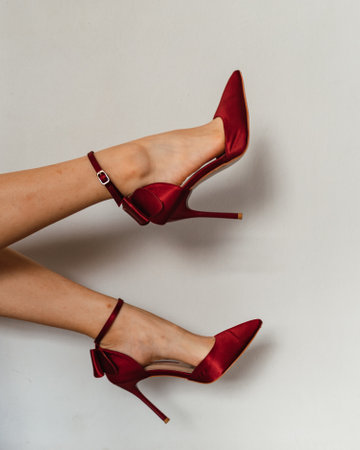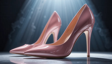 Elegant stiletto heels with red soles positioned under soft lighting.