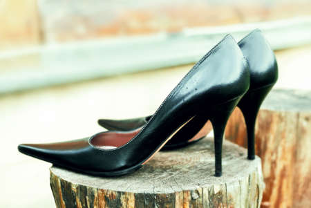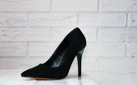 High heel women shoe on the background of a brown wall. Shallow DOF