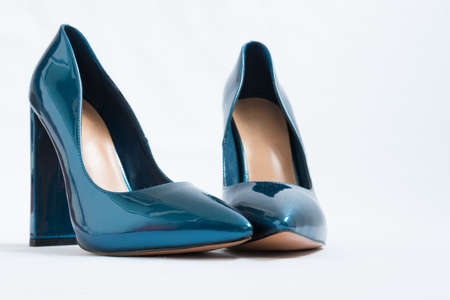 Womens patent leather high-heeled shoes. Beautiful and stylish womens shoes. Deep blue shoes. stylish and trendy