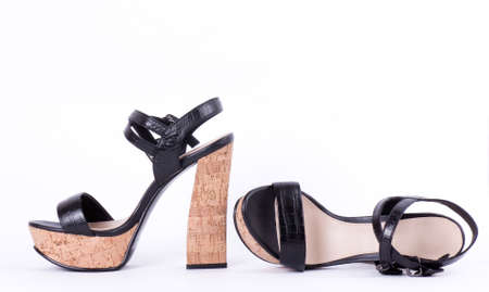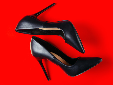 Women high-heeled shoes, isolated on a black background. Modern fashion accessory. Stylish and sexy walking shoes. The concept of women beauty and fashion. Top view, close-up