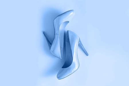 Woman high heel shoes on blue background toned. Fashion blog look. Top view, flat lay.