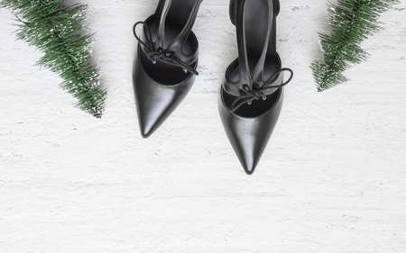 Flat lay black high heel shoes and mini christmas tree on grunge white wood background, Merry Christmas and winter season fashion background concept. Top view with copy space.