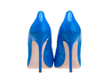 Women high-heeled shoes. A pair of beautiful blue shoes, back view.