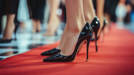Close-up of luxury high heels walking on a red carpet, showcasing elegance and style at a high-profile ceremony or celebration.