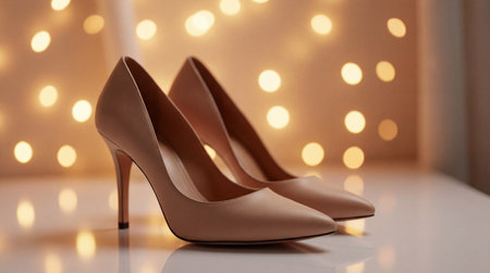 Elegant nude high heels on a reflective surface with warm bokeh lights in the background.