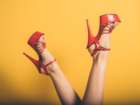 Female feet in beautiful red stiletto shoes, yellow background copy space. Feet in white jeans and shoes raised up.